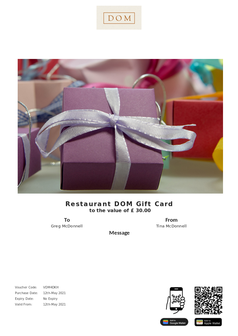 Restaurant DOM allows you to purchase instantly printable gift vouchers, special offers and tickets using the Voucher Connect platform.